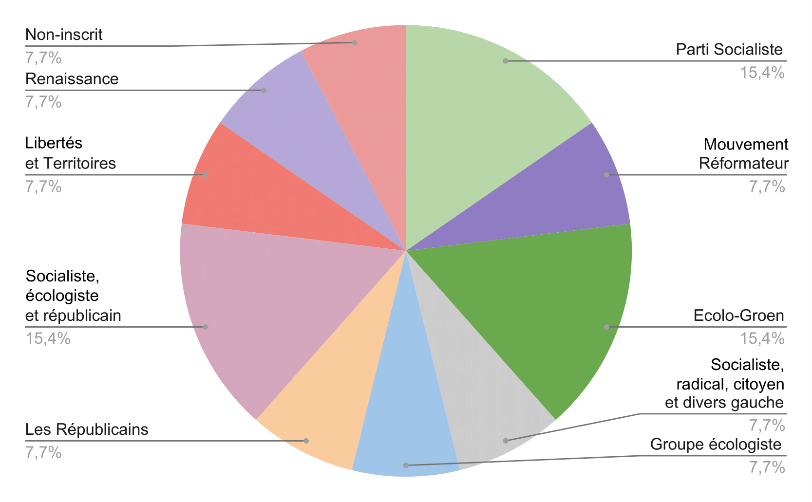 Sur la période sélectionnée, la figure 1 met en évidence que les groupes socialiste, écologiste et républicain, le Parti socialiste ainsi qu’Ecolo-Groen se distinguent comme les groupes les plus proactifs sur la question, avec chacun 15,4 % des initiatives à leur actif2.