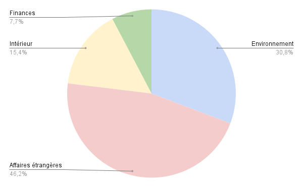 En ce qui concerne les commissions, groupes de travail ou ministères interrogés, la figure 2 révèle que les Affaires étrangères occupent la première place avec la prise en charge de 46,2 % des textes, suivies par l’Environnement avec 30,8 %, puis par l’Intérieur (15,4 %) et enfin, les Finances (7,7 %). La prise en charge de la question au niveau de l’assemblée belge semble principalement s’effectuer par le prisme des relations extérieures. Les aspects de politique interne liés à la gestion nationale des migrations climatiques sont également pris en compte, mais dans une moindre mesure, tout comme les impacts environnementaux et les questions de santé publique. En ce qui concerne les deux chambres françaises, les ministères et les commissions semblent adopter une approche plus multidimensionnelle. Ils couvrent un large éventail de responsabilités, en mettant essentiellement l’accent sur les aspects internationaux et de défense, tout en abordant également, de manière accessoire, les dimensions environnementale, financière et de développement.