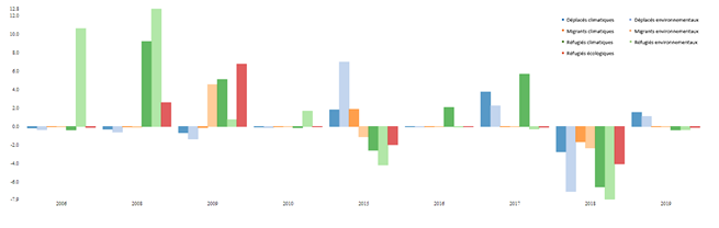 Si l’expression de réfugiés environnementaux était la plus fréquente, avec 10,63 % d’occurrences en 2006 et 12,77 % en 2008, nous remarquons une nette diminution à partir de 2009, puis une inversion de la courbe au profit de déplacés environnementaux qui se positionne en tête en 2015, avec un total de 6,99 % d’occurrences. Cette appellation s’aligne sur la terminologie de l’Agenda pour la protection des personnes déplacées au-delà des frontières dans le cadre de catastrophes et de changements climatiques, adopté par 109 États en octobre 2015. Par ailleurs, cette année s’est caractérisée par la médiatisation des débats sur les lexèmes destinés à désigner les populations migrantes (Calabrese & Veniard, 2018), comme en témoigne la réponse du ministre des Affaires étrangères et du Développement international à une question écrite en 2017 :
