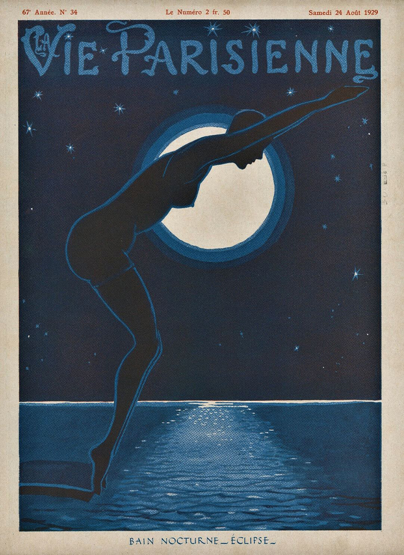 La baignade nocturne constitue un topos littéraire et pictural généralement associé à la nudité et à la transgression des règles sociales diurnes. Le « bain de minuit » est à ce point ancré dans les représentations collectives qu’il a inspiré et donné son nom à des gammes de cosmétiques, convoquant un imaginaire sensuel et lointain. Sur le site Internet de la marque Equatoria, on lit par exemple : « Au Pays du Pain de Sucre, la Brume de Soin Bain de Minuit à Ipanema célèbre le culte de la beauté avec des notes parfumées joyeuses irrésistiblement séduisantes. Cette eau parfumée est un séduisant bain de vitalité1 ». Avant que ne s’opère la récupération par le marketing, le bain nocturne s’affichait déjà en août 1929 en couverture du magazine illustré La Vie parisienne, offrant au regard du lecteur, souvent masculin depuis l’inflexion grivoise de la publication à partir de la fin du xixe siècle2, un corps féminin découpé de profil en ombre chinoise sur fond de clair de lune, dans un maillot de bain moulant donnant à voir un corps galbé aux formes suggestives3.